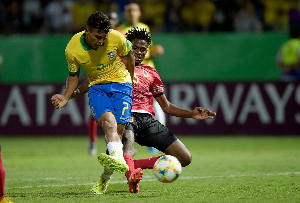 Patryck, lateral-esquerdo do Brasil, tenta parar o ponta Zito, de Angola, que deu trabalho à seleção anfitriã (Foto: Alexandre Loureiro/CBF)