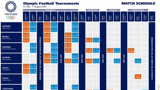 Brasil x Alemanha, a final olímpica masculina do futebol no Rio-2016, será o primeiro jogo do Grupo D de #Tokyo2020 no dia 22 de julho, às 17h30m (hora local), 5h30m da manhã de Brasília. O palco é o remodelado Estádio Internacional de Yokohama, o mesmo onde os dois países decidiram a Copa do Mundo-2002.